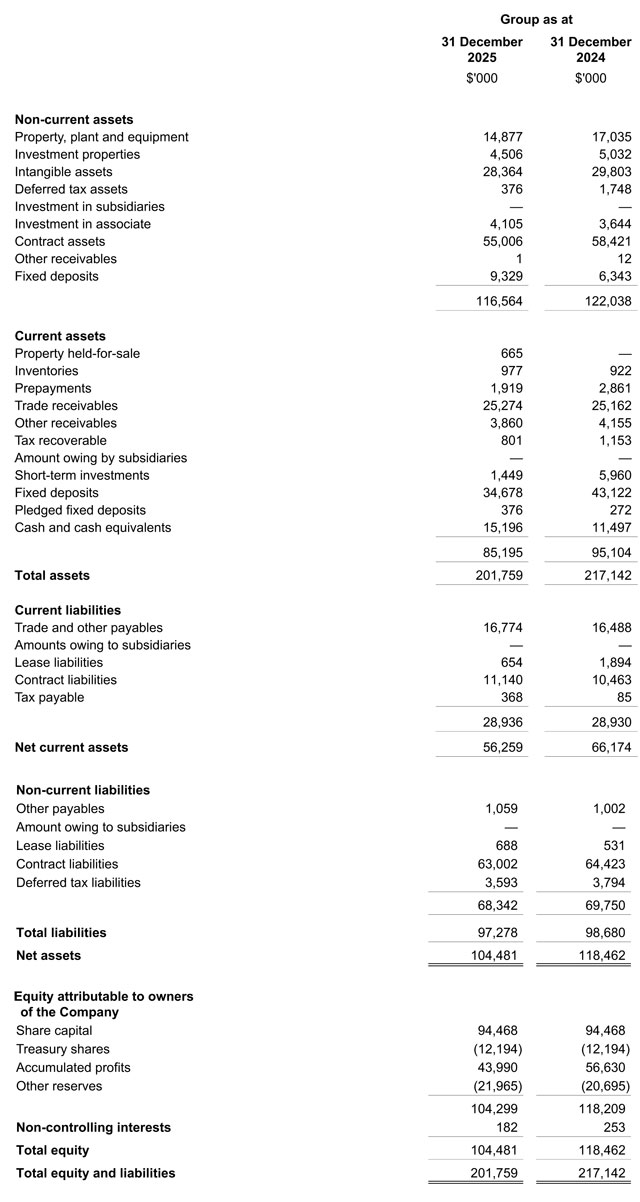 As at 31 December 2025, the Group maintained a strong balance sheet, with cash and cash equivalents, fixed deposits, investments of S$61.0 million (31 December 2024: S$67.2 million). Investments mainly comprise of short-term investments in money market funds.